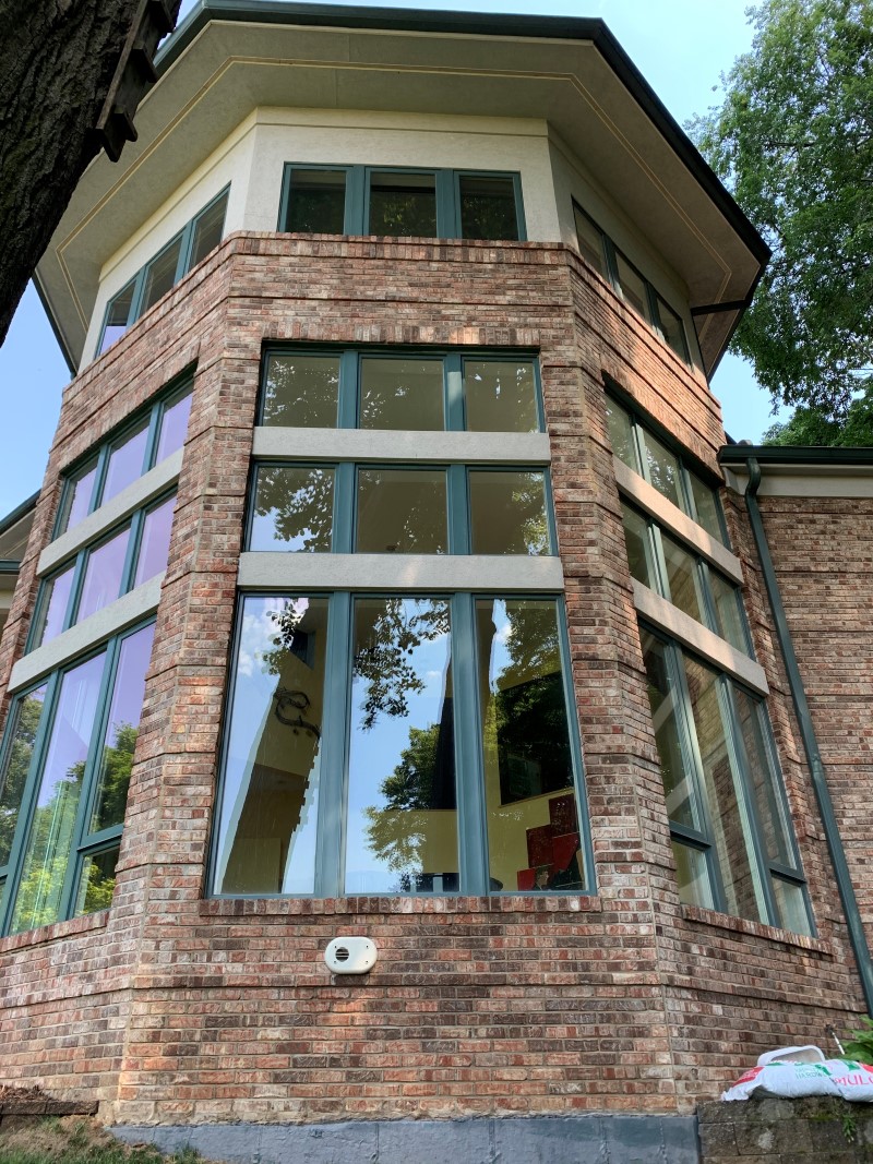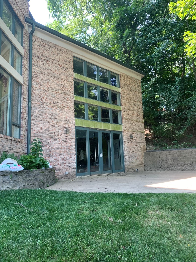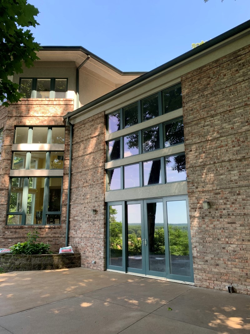 We were called out to this stone and brick home in Chesterfield MO that was in need of some cleaning. The house was covered in algae and all the stone was turned green. After applying cleaner all the geothermal was killed and looses up so we can rinse it away.